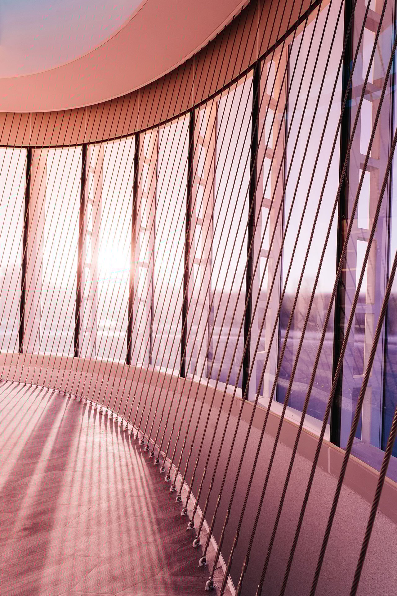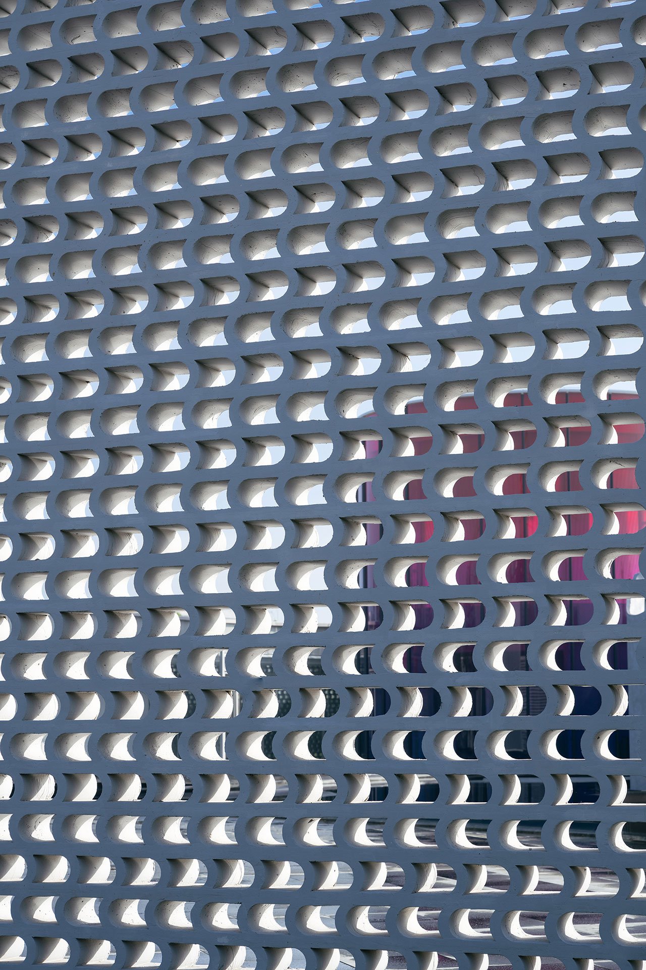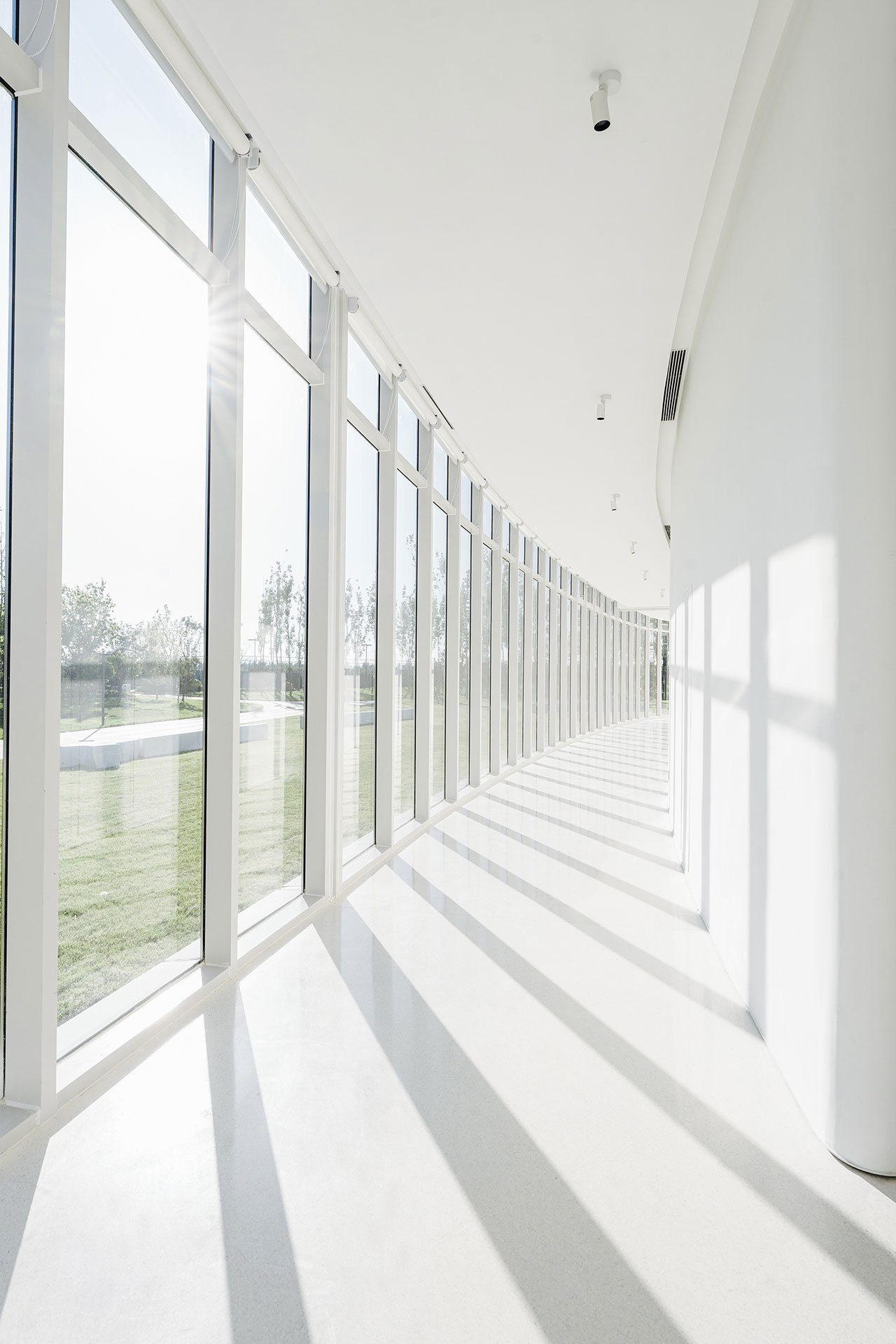 As the most introverted of all the spaces, the theatre’s solid volume is punctured only by a curved skylight that allows both sun and moonlight to spill into the cavernous space like a “waterfall”. On the contrary, the glass-enclosed dance and yoga studios are inundated with natural lighting, with the former clad in translucent glazing panels for privacy, and the way in which latter enveloped in red-to-blue ombré glass, an unexpected gesture that adds a welcoming splash of colour in the otherwise monochromatic colour scheme.