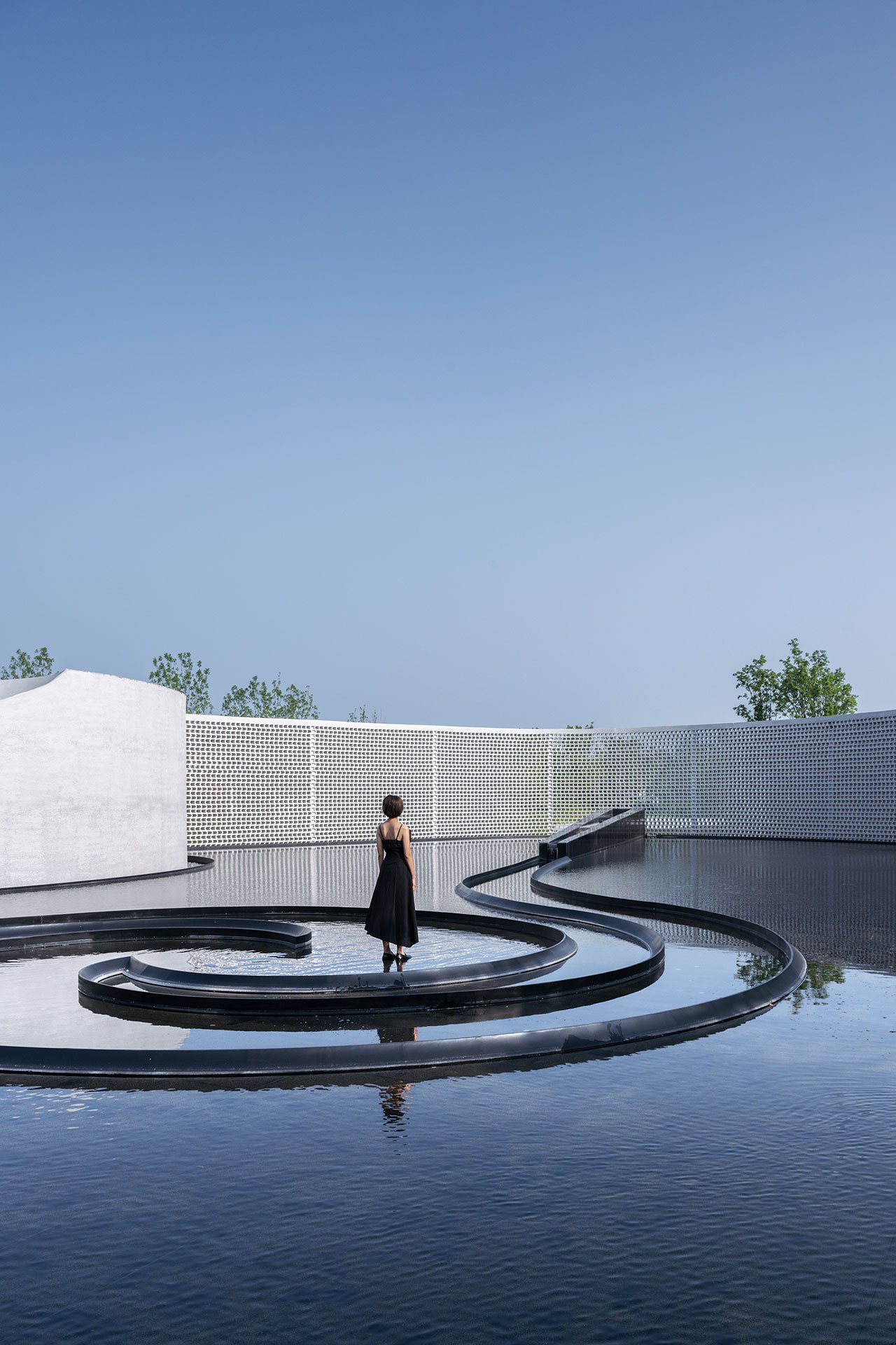 The choreographed circulation of visitors around the central reflection pool is echoed by a sinuous flowing water channel that Ting describes as “a surging current in the calm water courtyard”. Beginning as a fountain, the channel spirals and twists its way across the vast pool before it disappears below the yoga space, coursing through the building’s foundation and finally emptying out of sight into the Yellow Sea. The stream’s ethereal sensibility is matched by the encircling “flower” wall, a lattice construction made with curved concrete blocks, and six trees that seem to grow out of the pool, a reference to a landscape painting by the Yuan dynasty artist Ni Zan – ultimately providing another facet in how the Museum has succeeded in paying tribute to both traditional Chinese landscape painting and zen sculpture gardens.