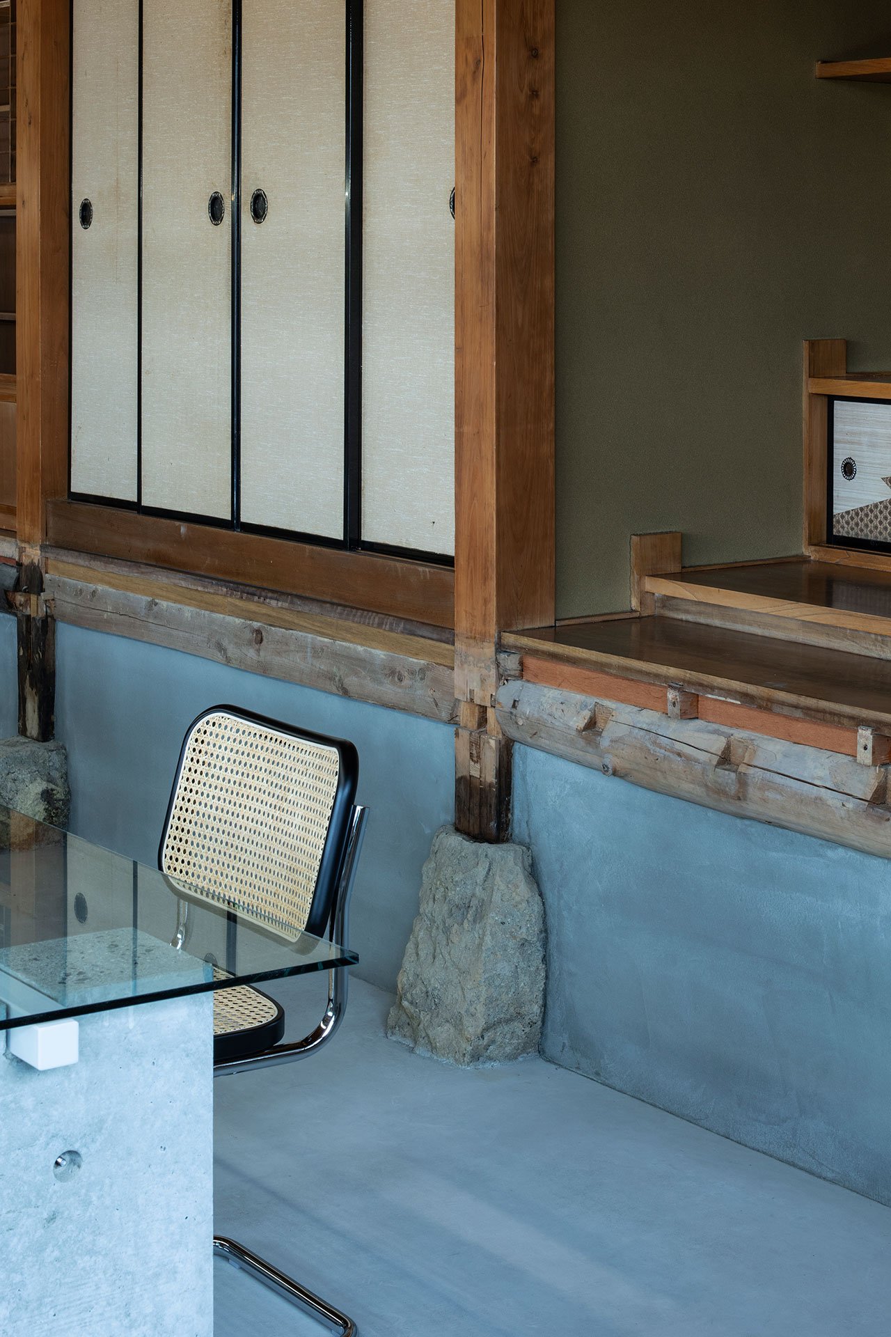 On the ground floor, the team removed the existing ‘tatami’ flooring, a traditional type of mat commonly used in Japanese houses for both living and sleeping areas which however doesn’t fare well in the context of an office area, creating a series of sunken office spaces featuring built-in concrete and glass working counters, meticulously designed to discreetly incorporate electrical and cable outlets. The contemporary design of these furnishings is juxtaposed with the building’s rock foundations which have been exposed by lowering the floor level and which now form part of the new concrete floors. The sunken level also means higher ceilings, while the existing alcoves known as ‘tokonoma’, which are traditionally used for displaying paintings, pottery, flower arrangements and other artworks, have taken on a more functional role as storage spaces.