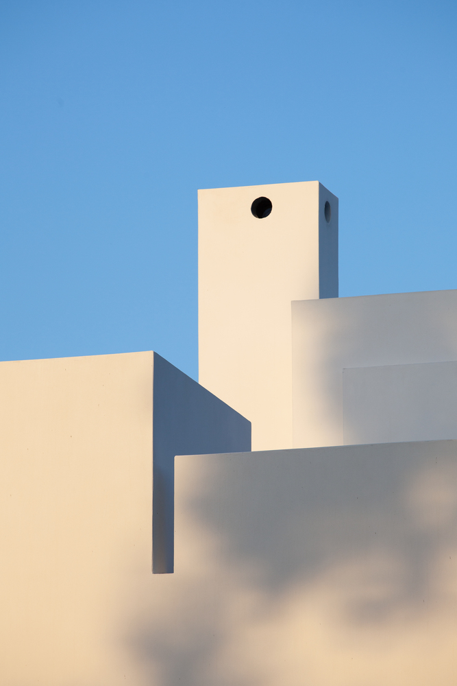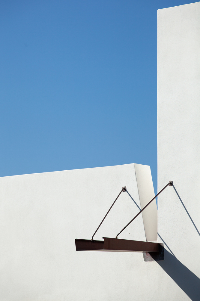 There is a strong contrast between the exterior and the interior. The façade functions as a shell that occasionally allows, through openings, the contact between the house and the world. When the shutters are closed, the façade is its own denial, it is an anti-façade. It cancels an interior, suggesting only matter. It would become an abstract sculpture if the two copper gargoyles did not denounce a functional concern. The ornamental exaggeration of those gargoyles contrasts with the dryness of the façade.