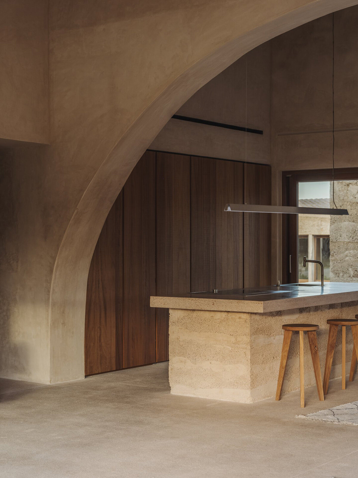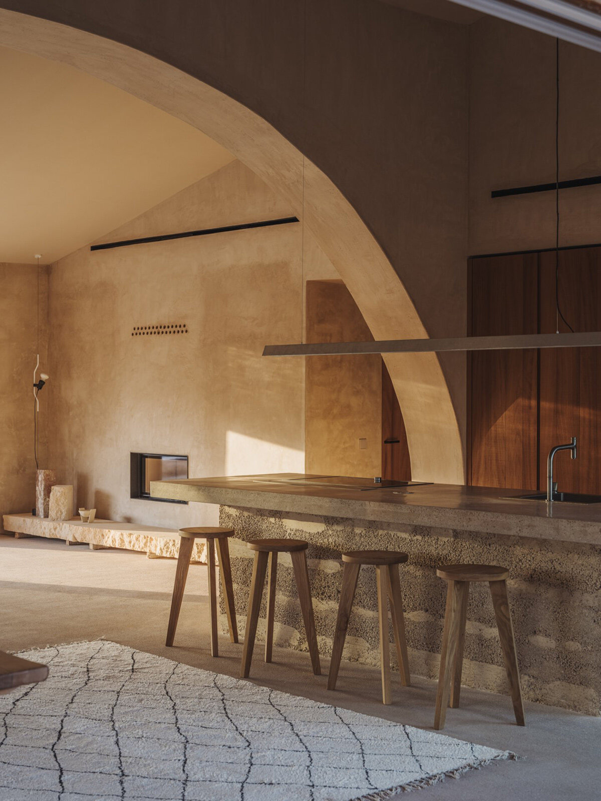 In the construction of Ca na Pau, the architects at Munarq are heavily influenced by the use of locally sourced and sustainable materials. The house is primarily built from earth, lime, and stone, which integrate with the surrounding environment. These materials both emphasize the home’s connection to the landscape and reflect a commitment to environmentally conscious building practices. Munarq’s use of traditional building techniques, such as lime plaster and earth-based construction, ensures that the house maintains harmony with its surroundings while reducing its environmental impact. This combination of local resources and sustainable methods highlights the balance between human craftsmanship and the natural world.