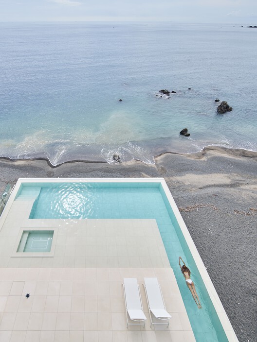 Text description provided by the architects. It is a villa with 1 basement floor and 2 floors above ground on a seaside site in Kanagawa prefecture. The site is located in a villa area along the coast. A large opening is planned on the south side overlooking the sea, and the terrace and pool on the first floor create a façade with a white volume protruding toward the sea on the existing revetment retaining wall.