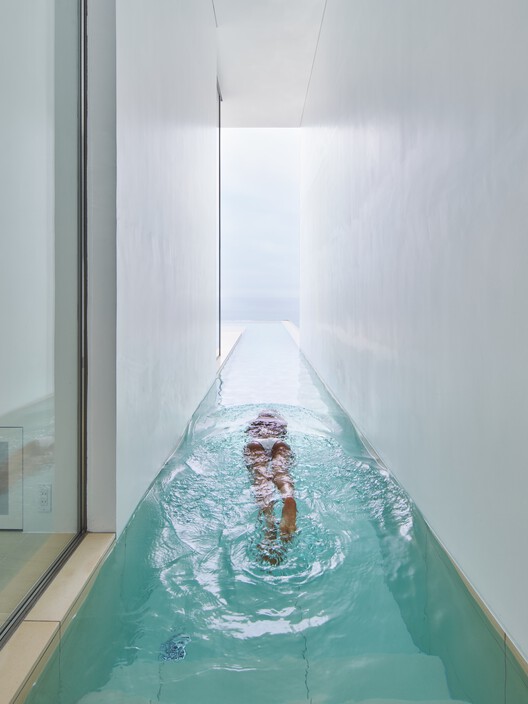 In the semi-external space next to the living room separated by glass, an 18m pool extends toward the sea and constitutes a scene leading to the infinity pool. The room is simple with white as the base color, and the neutral space without extra decoration is a space where you can feel the transition of nature that changes its expression every moment. “SKYPOOL VILLA” where you can enjoy a large panorama in your living space with a clear space composition.