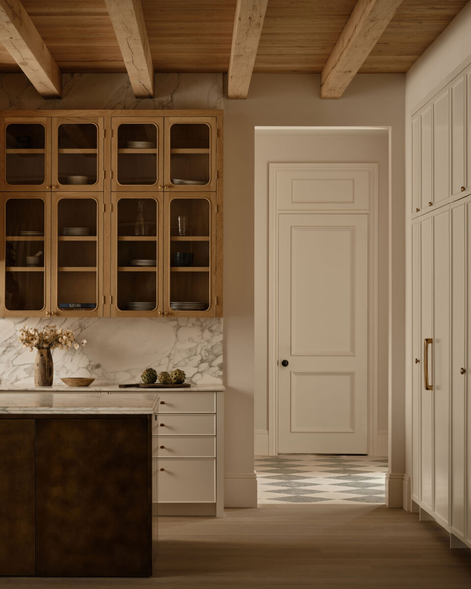 has a rustic farmhouse feel thanks to exposed beams and wooden cabinets crafted with softened edges and glass fronts for a look that instantly draws one in. Cole and her team have juxtaposed nostalgic influences with more dynamic and adventurous inclusions – notably in the form of a custom-made marble-topped island, which stands out against the backdrop of traditional white oak cabinetry.