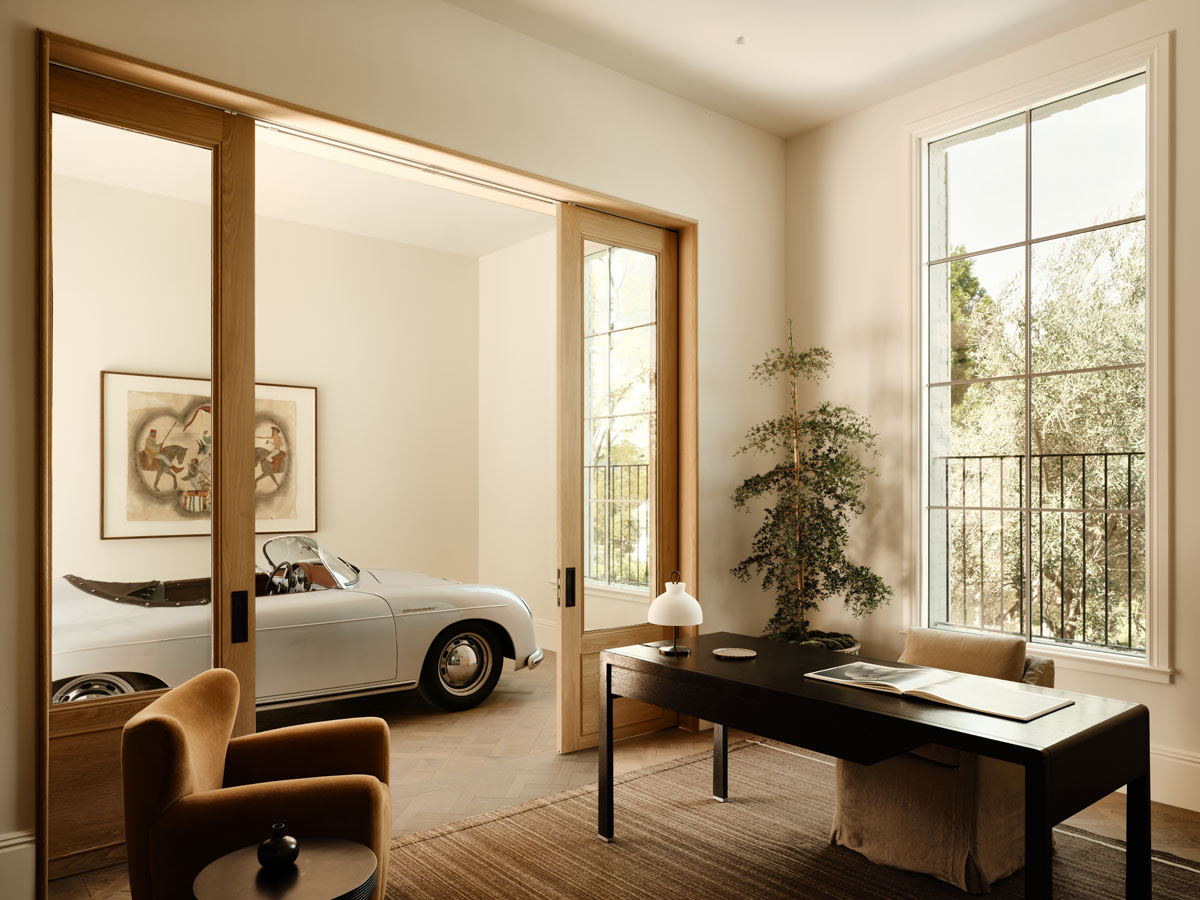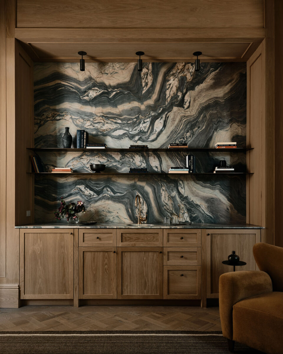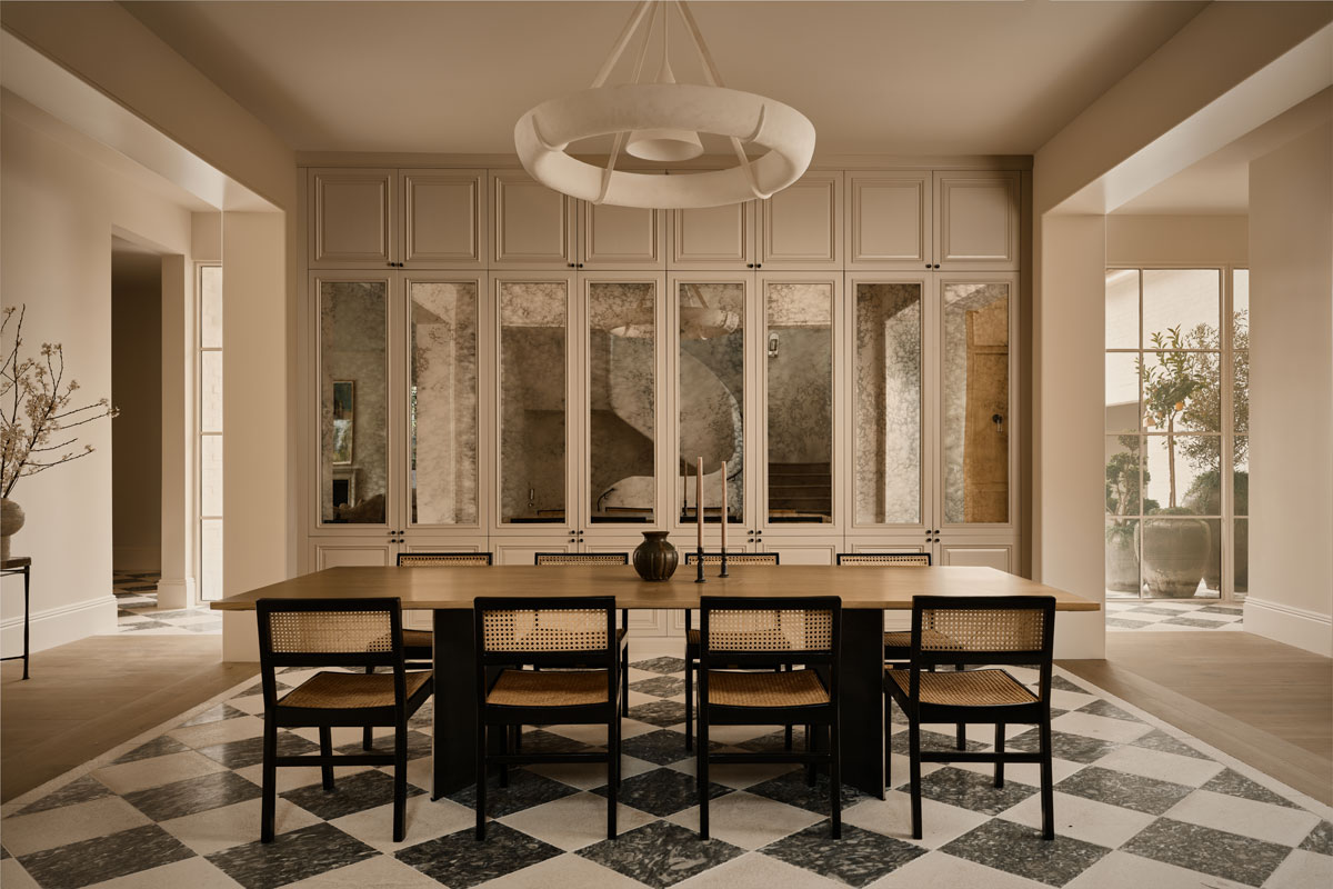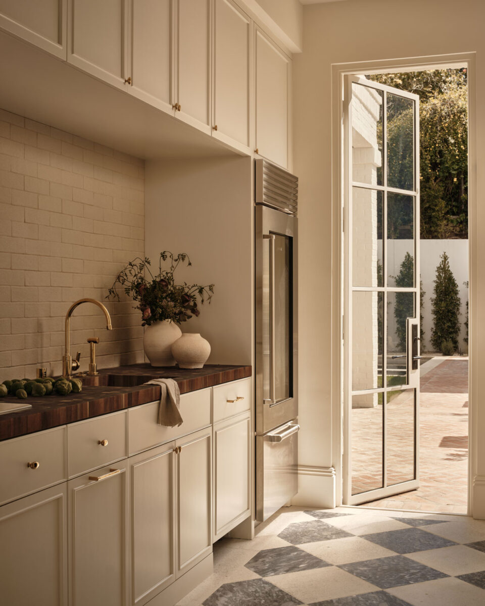 ‘chef’s kitchen’ is more intentionally decorative, elevating its importance as an intimate and homey ‘nook’ in the home. Full of subtle patterns and textures, it features a thick butcher’s block crafted from dark walnut, a checkered marble and limestone tiled floor and a white ceramic tiled backsplash. A gentle pale palette reflects natural light around the room which pours in from a glass panelled door leading to a paved terrace for a seamless indoor-outdoor configuration.