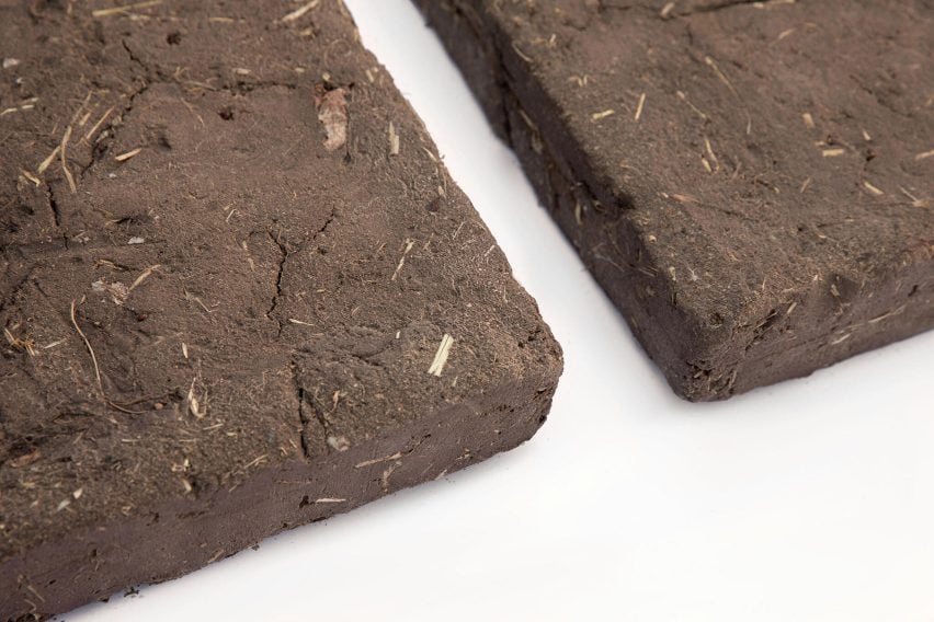The clay is mixed with natural additives and fillers including flax, barley, nettle, lemon balm and wood shavings before being shaped into panels and bricks that are air-dried to retain the material’s natural properties.